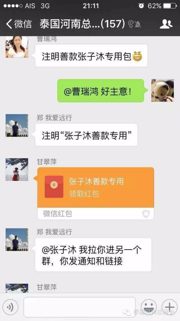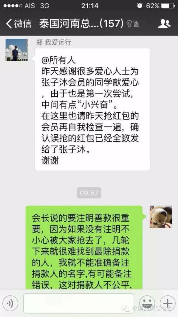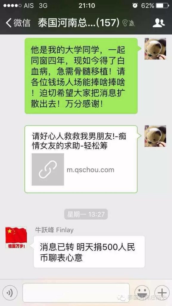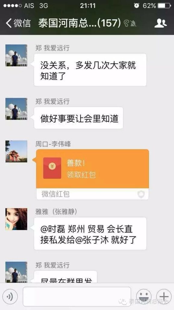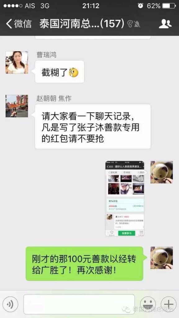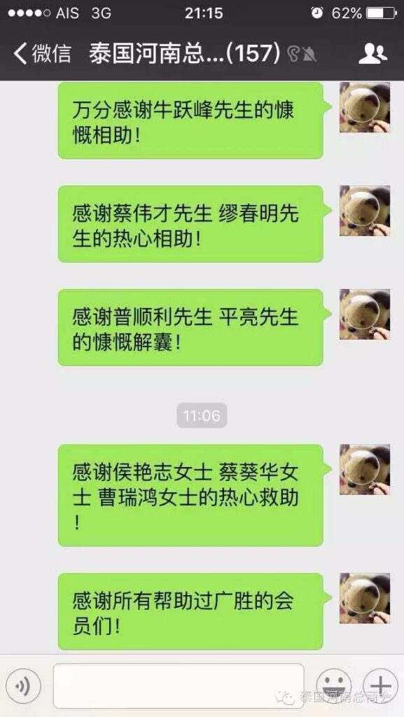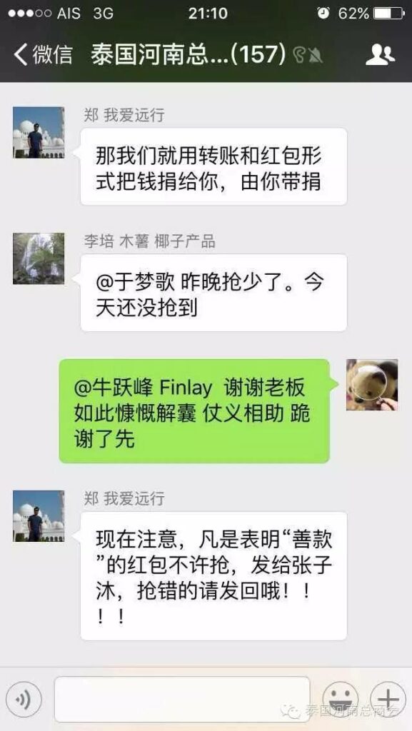 2016年2月22日,泰国河南总商会的微信群里,出现了一条由会员张子沐发出的求助信息牵动了大家的心——请好心人救救我的同学于广胜,信息一经发出,立刻引起了群内会员的广泛关注,牛跃峰副会长立刻做出回应!时磊会长第一时间送出善款红包,并开启了通过微信红包募集善款的先河,时会长一直提醒大家不要抢善款红包,甘翠萍副会长,马艳萍副会长也陆续发来善款,一时间,群里出现最多的就是“善款” “善款专用”这些充满正能量的字眼!一个个红包传递着互帮互助的爱心,传递着慷慨募捐的善心,传递着海外华人对同胞的关心,一个个红包把海外华人与躺在病榻上的患者紧紧联系在一起。