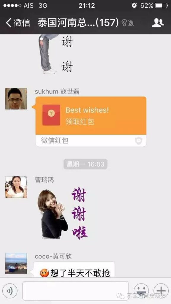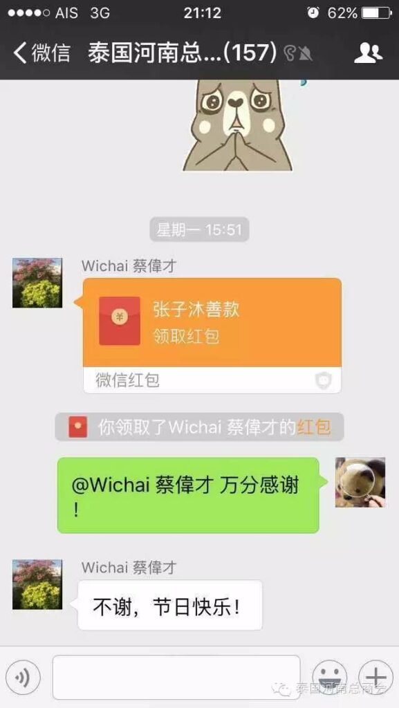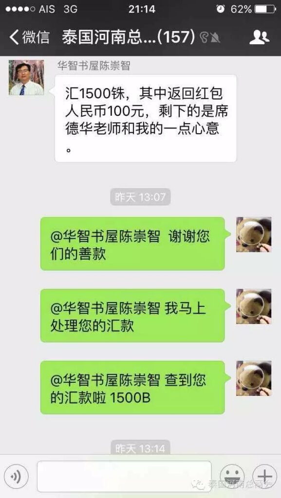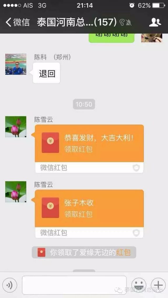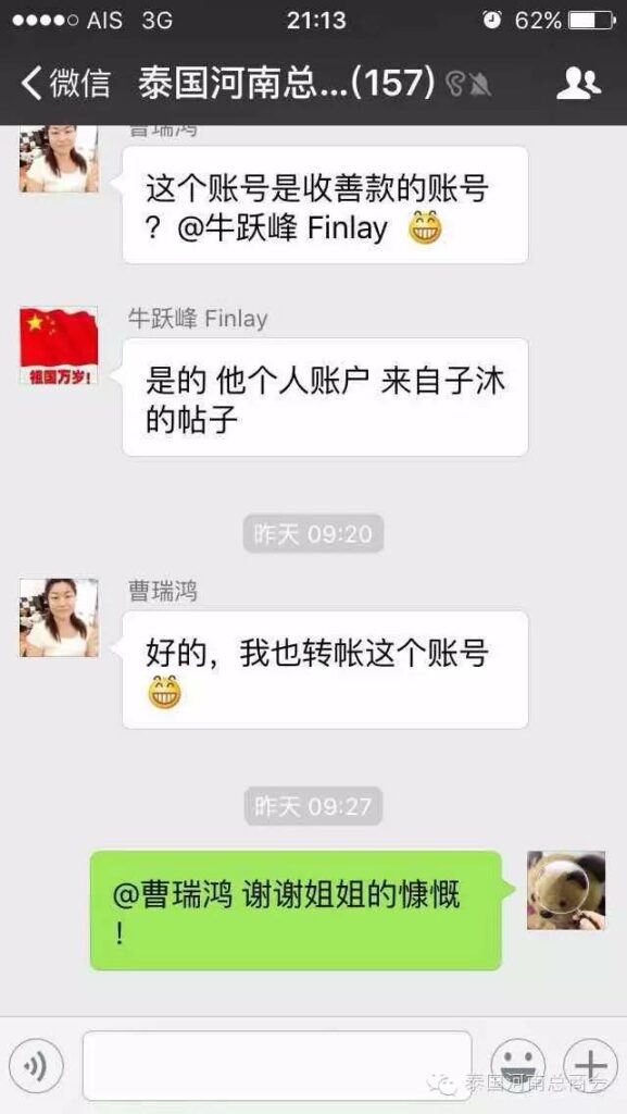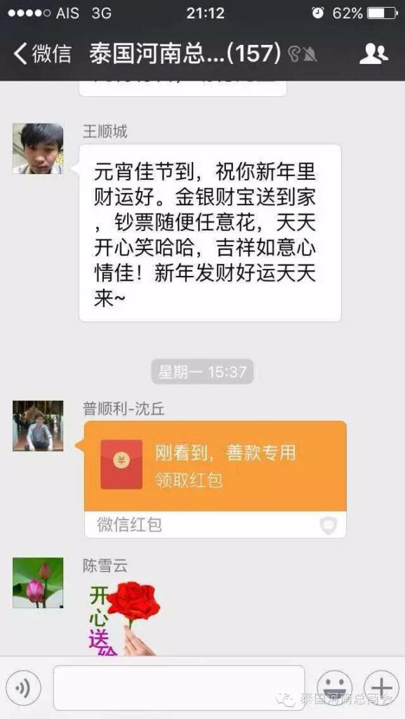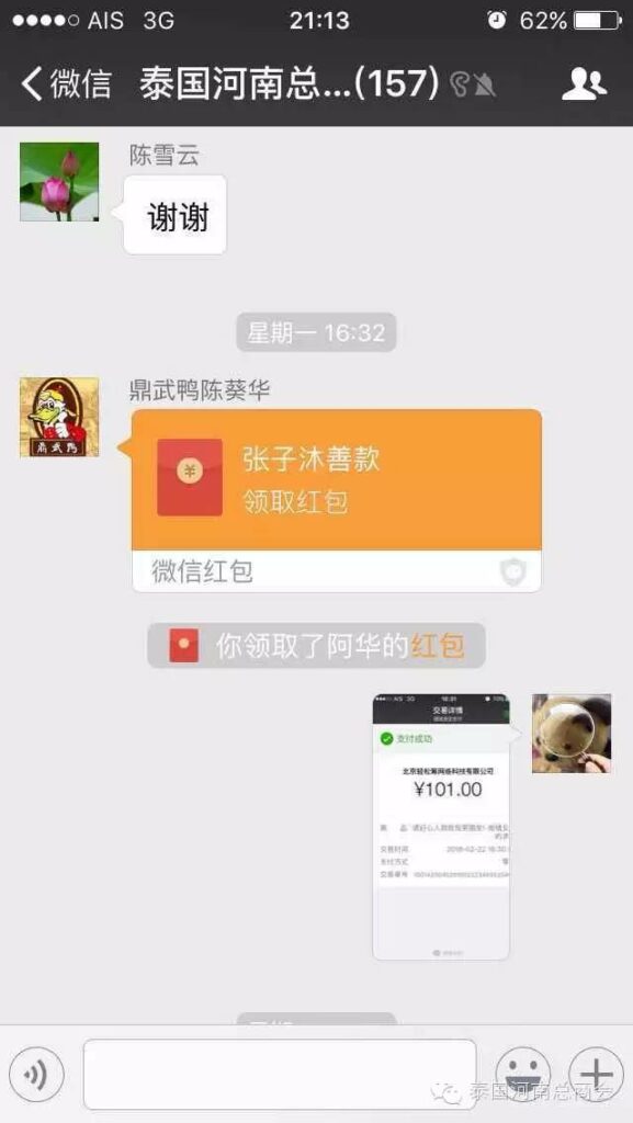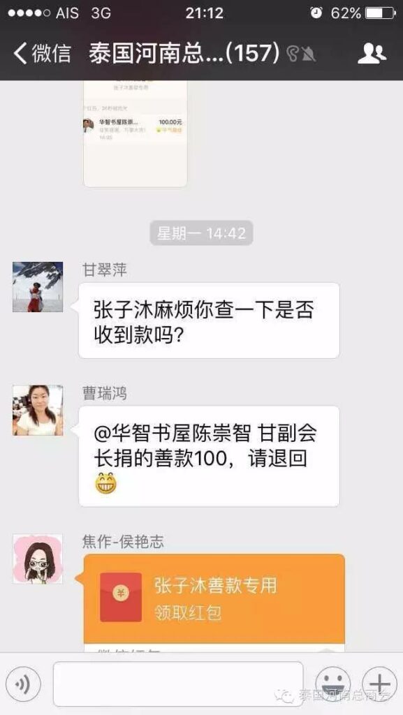 2016年2月22日,泰国河南总商会的微信群里,出现了一条由会员张子沐发出的求助信息牵动了大家的心——请好心人救救我的同学于广胜,信息一经发出,立刻引起了群内会员的广泛关注,牛跃峰副会长立刻做出回应!时磊会长第一时间送出善款红包,并开启了通过微信红包募集善款的先河,时会长一直提醒大家不要抢善款红包,甘翠萍副会长,马艳萍副会长也陆续发来善款,一时间,群里出现最多的就是“善款” “善款专用”这些充满正能量的字眼!一个个红包传递着互帮互助的爱心,传递着慷慨募捐的善心,传递着海外华人对同胞的关心,一个个红包把海外华人与躺在病榻上的患者紧紧联系在一起。